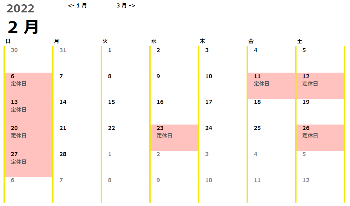 2月は祝日も相まって定休日が多めになっております。ご了承くださいませ。