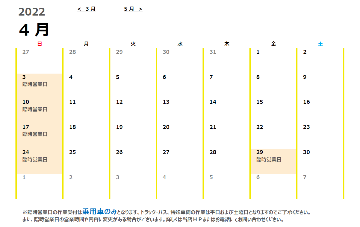 4月は当店では 祝日や日曜日も営業(乗用車のみ作業受付) いたします!!
