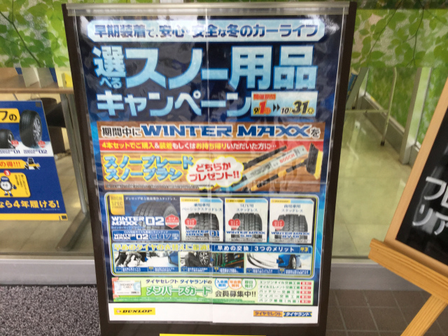 期間中にスタッドレスタイヤの「ウィンターマックス」を4本ご購入で装着若しくは持ち帰りのお客様に、スノーワイパーまたはスノーブラシをプレゼント中です。