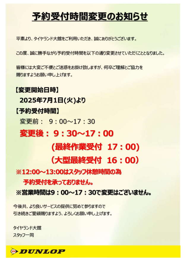 いつもタイヤランド大館をご利用いただきありがとうございます。 店頭予約の受付時間変更を再度お知らせします。 (内容は5月31日のお知らせと同様です。) 詳細は下記画像をご覧ください。 お客様にはご理解のほどを何...