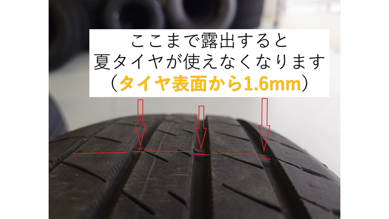 タイヤの溝との間にある溝底の突起、この突起が接地面に露出した場合、使用限界である1.6mmに達したことを表しています。