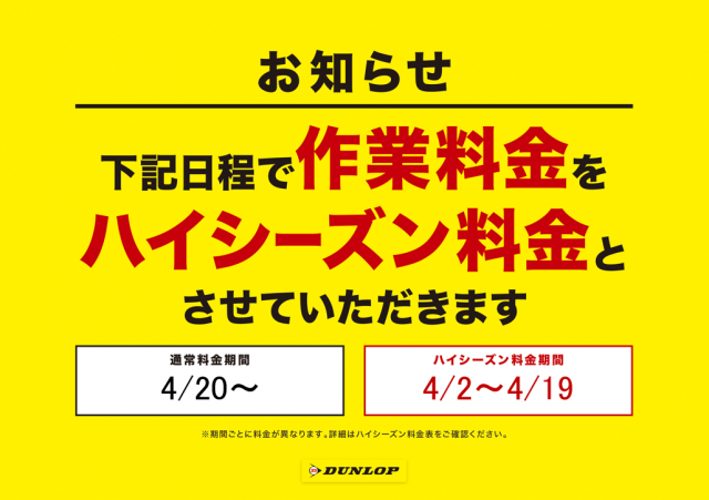 いつもタイヤランド能代をご利用いただきありがとうございます。 4/2から4/19までハイシーズン期間とさせていただき、 脱着作業料に税込1,100円を追加させていただきます。 ご理解の程お願い申し上げます。
