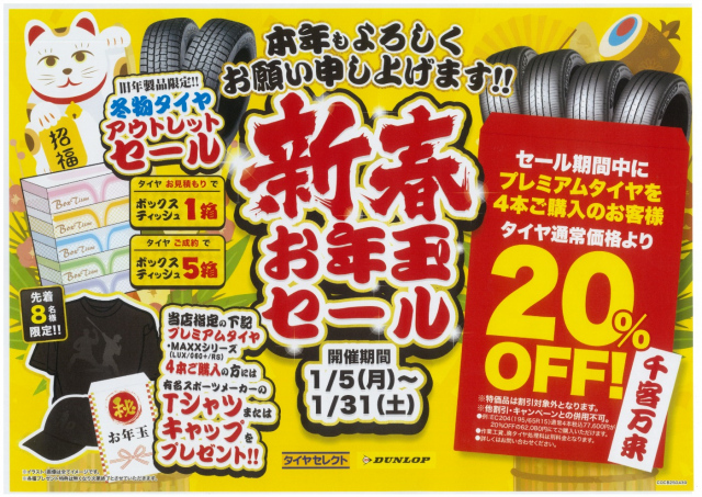 冬季休業をさせていただいておりましたが、本日より 通常営業させていただいております。 さっそくですが新春お年玉セール!! 当店指定のプレミアムタイヤ(RS、060+、LUX)4本ご購入で 通常価格より20%OFF致し...
