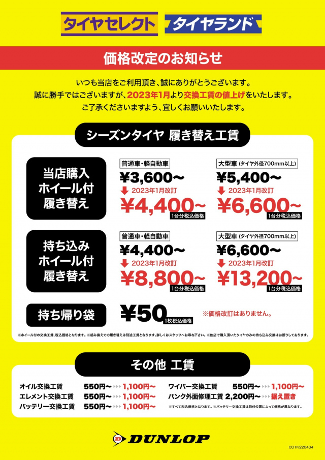 スタッドレスなどの履き替えの作業料も上記の通りになります。