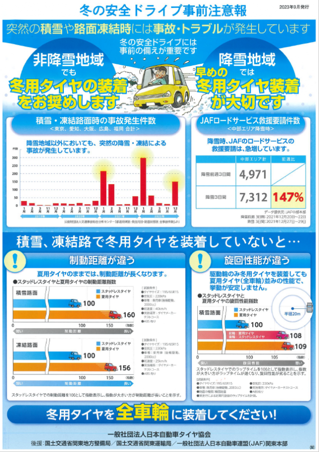 特に積雪が無くても、凍結などがあれば大変危険です。早目の冬対策をしましょう。