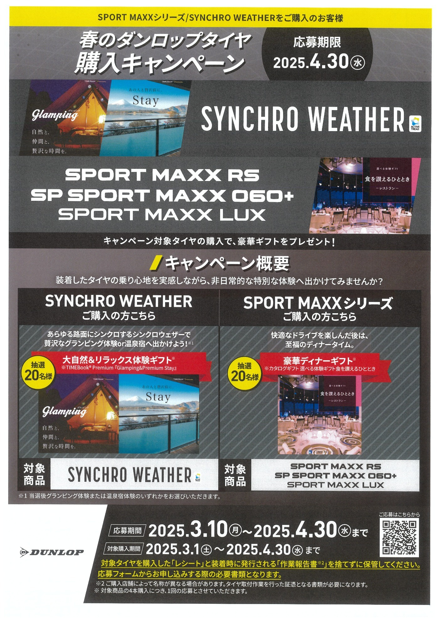 4月30日まで、DUNLOPの対象タイヤを4本ご購入いただくと応募いただけます。