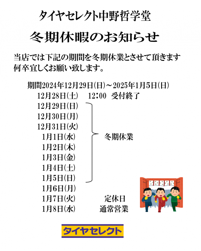 年末年始は29日から年明け1月5日まで冬季休業となります。