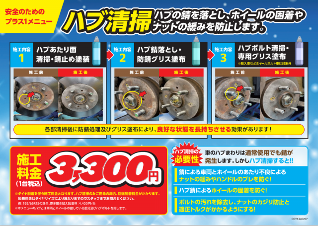 ハブ清掃のみご用命の場合、別途脱着料(4,400円)が発生するので、タイヤ交換、タイヤローテーション等、タイヤ脱着時にやるとお得です!