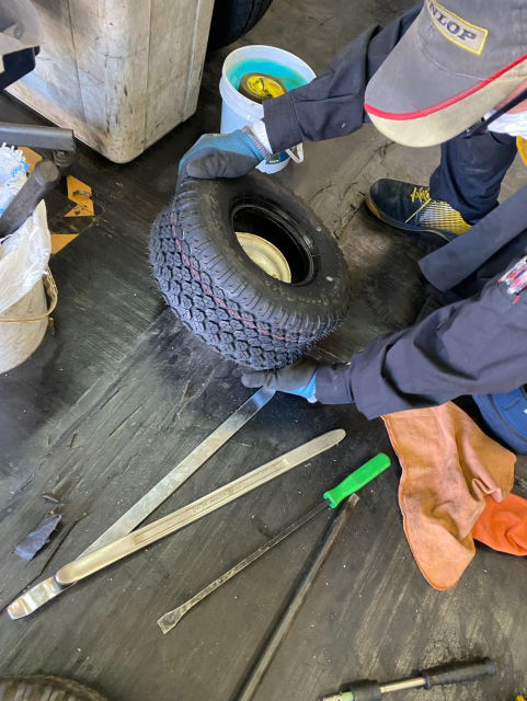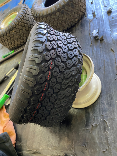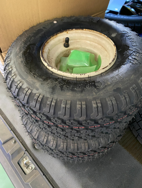 ゴルフカートか芝刈り機のタイヤと思われますが不明。