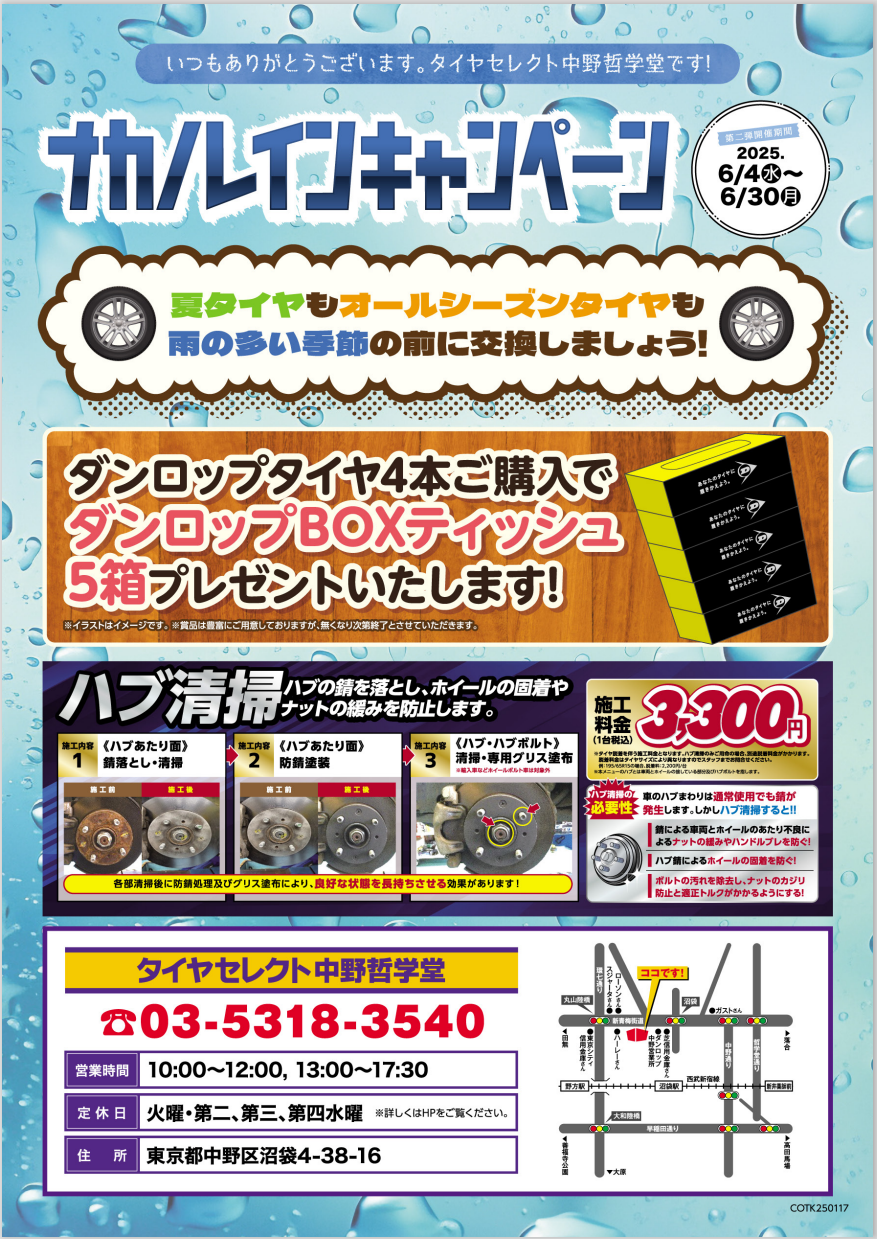 大好評につき 6月は!ナカノレインキャンペーン!【ダンロップタイヤ購入でBOXティッシュプレゼント!】