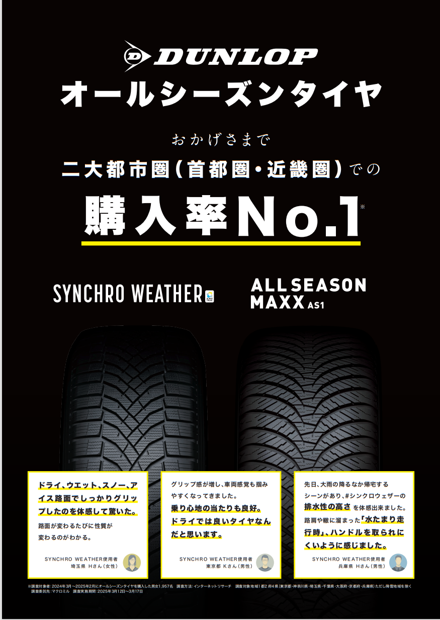 大好評ダンロップのオールシーズンタイヤ、この首都圏でも好評いただいております!
