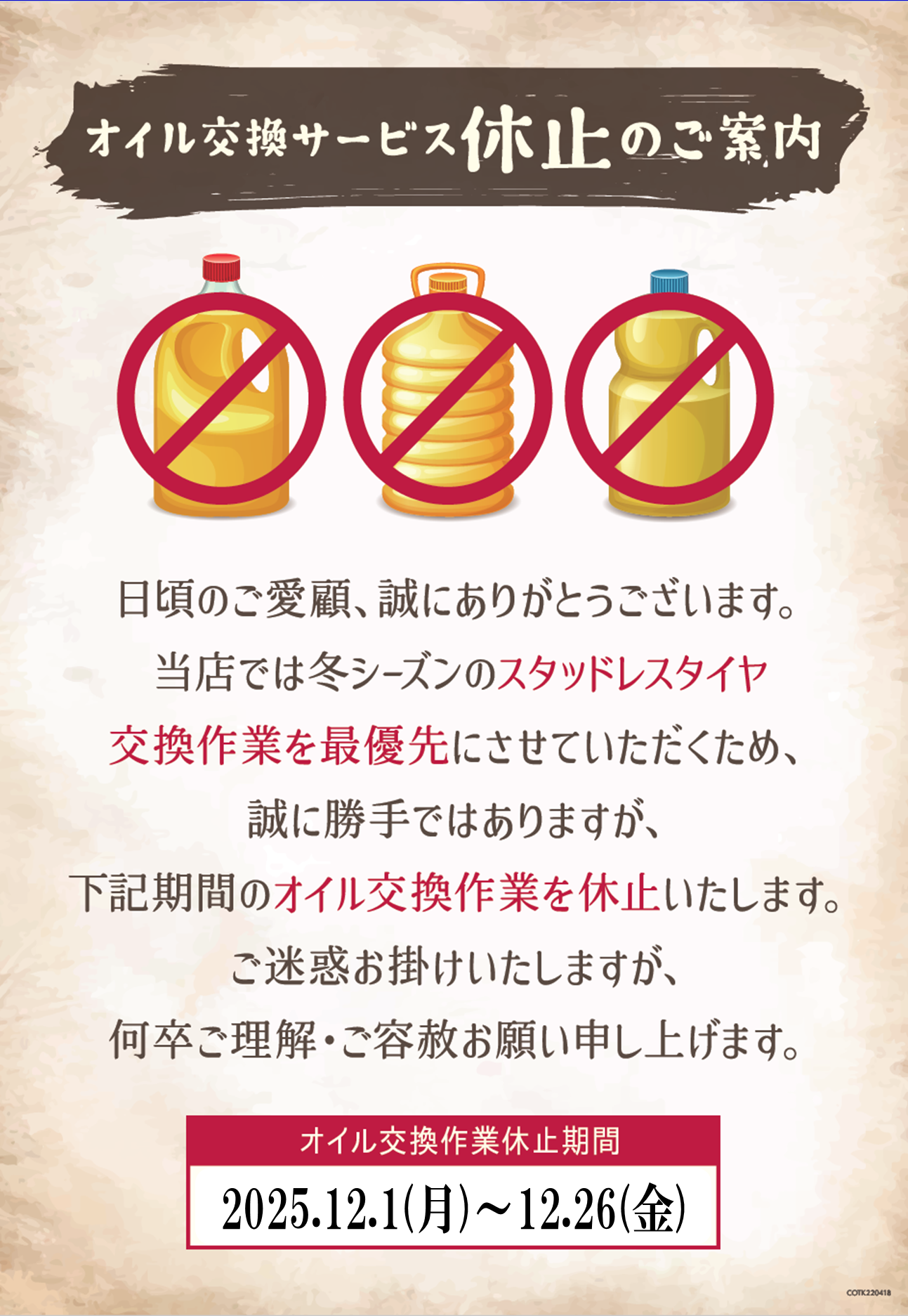 誠に勝手ながら12月の下記期間のオイル交換を休止させていただきます。