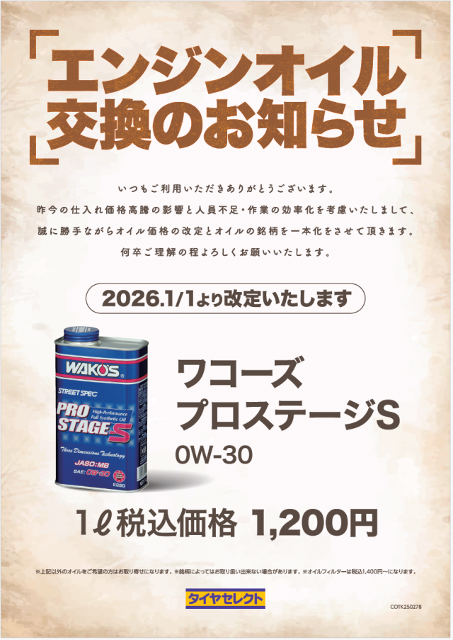 いつもご利用いただきありがとうございます。 昨今の仕入れの価格高騰の影響と人員不足・作業の効率化を考慮いたしまして 誠に勝手ながらオイルか買うの改定とオイル銘柄の一本化をさせて頂きます。 改定時期:202...