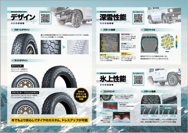 【GRANDTREK XS1】が新登場!!! (グラントレック エックスエスワン) このタイヤの最大のポイントは、 氷上性能はもちろん、今までなかった、 冬用ドレスアップタイヤなんです(・∀・)/ 特に、ジムニー乗りの方、デリカÐ5ユーザー必見です!!