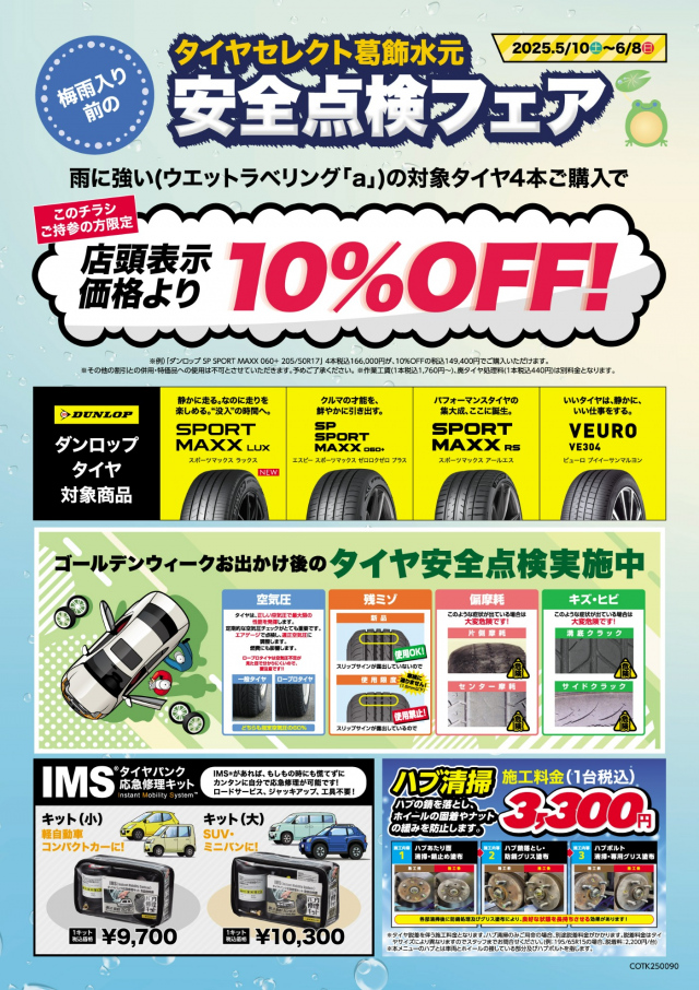 いつもお世話になっております。タイヤセレクト葛飾水元店です。 以前、告知させて頂いたオイル交換と4輪アライメント作業の件ですが、当店では冬タイヤへの履き替えが多くなり、作業に専念して頂きたく12月中...