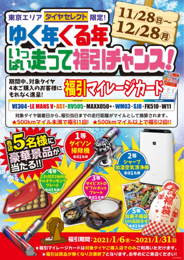 セール期間中に対象のタイヤを4本セットご購入で豪華景品が当たる福引チャンス!