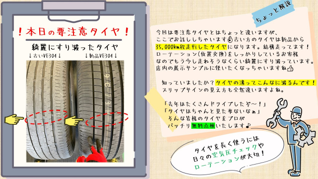 左側は購入時から35,000kmほど走行済のタイヤです。