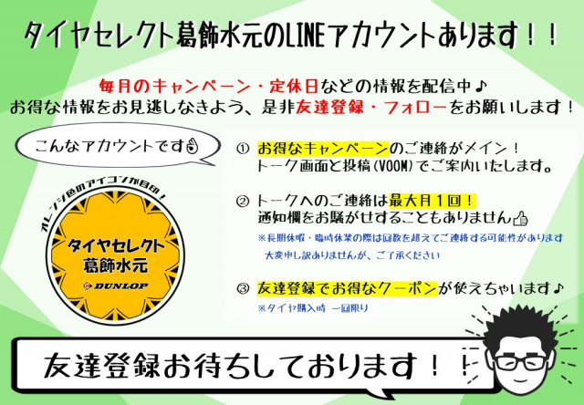 LINEでのお友達登録で何と作業工賃サービスいたします(`-ω-´)ゞ