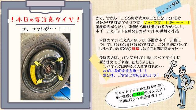 パンクをしてしまった為、お客様自身でスペアタイヤに交換してご来店。