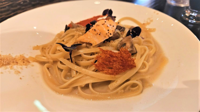 鴨を使った前菜、きのことサーモンのクリームパスタ、栗のデザート…
