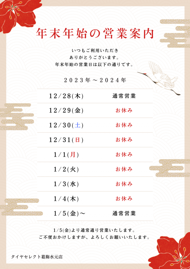 【年末年始休業期間】2023/12/28(木) ~ 2024/01/04(木)
