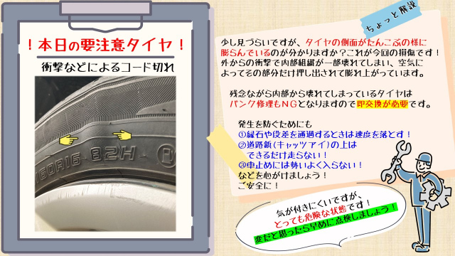 内側から壊れてしまっているタイヤは修理が出来ないので、即交換が必要!