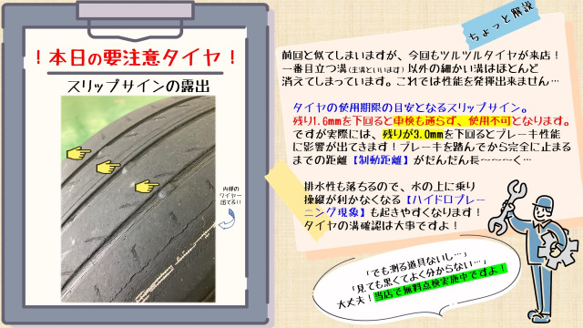 スリップサインの露出しているタイヤは即交換が必要です!!