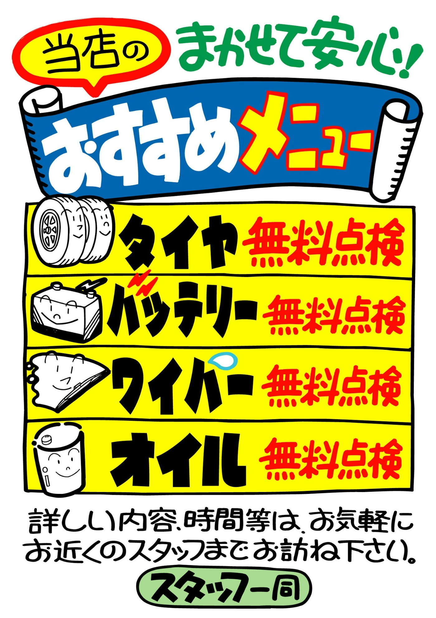 当店でもタイヤ・バッテリー・ワイパー・オイルの点検実施中ですので、御来店をお待ち致しております!!