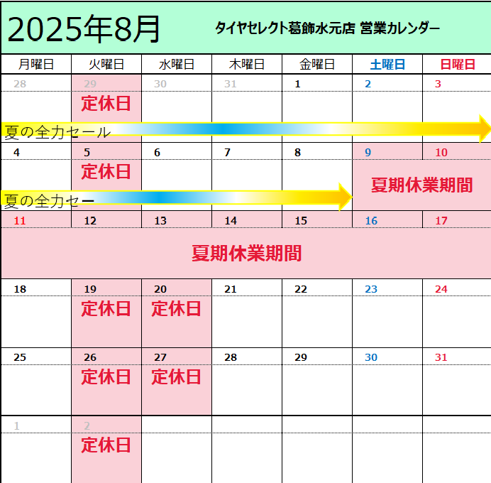 【お知らせ】8月の店休日と夏季休暇のご案内 こんにちは!タイヤセレクト葛飾水元店です!! 下記のカレンダーが8月度の店休日となります。 夏季休業日は 8月9日(土)~ 8月17日(日)となりますので、ご注意下さいね。 今月もタイヤセレクト葛飾水元店を宜しくお願い致します。 2025.08.01