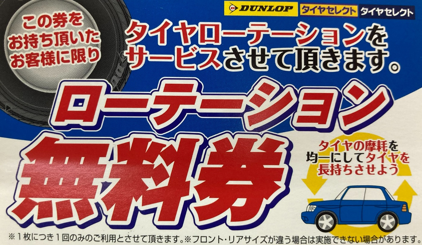 ※ローテーションとは...タイヤの位置交換により摩耗を均一にし、タイヤの寿命を延ばす事によりタイヤを長くご使用出来るメリットがあります。
