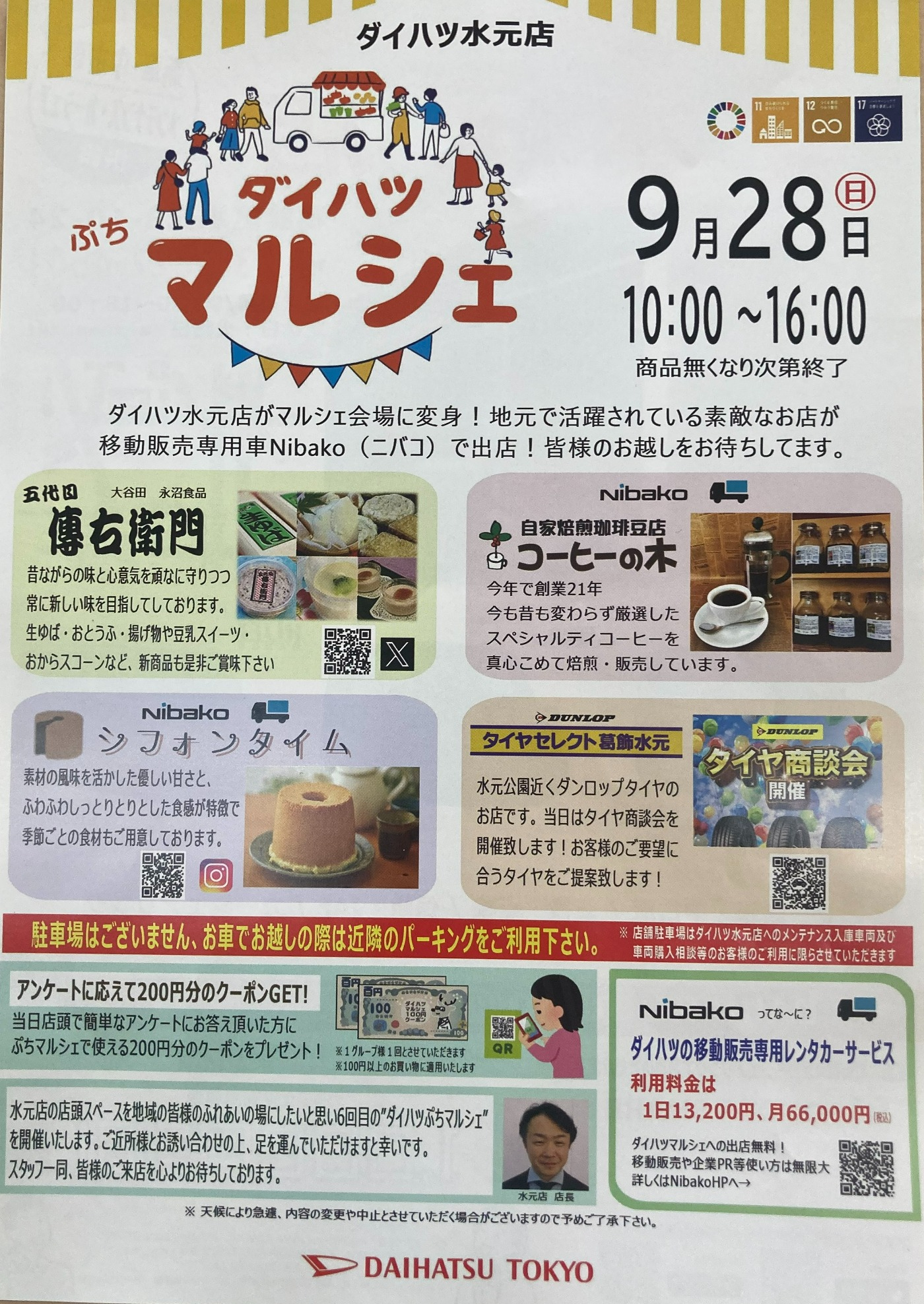 ダイハツ水元店がマルシェ会場へ変身し、色々なお店が出店されます。