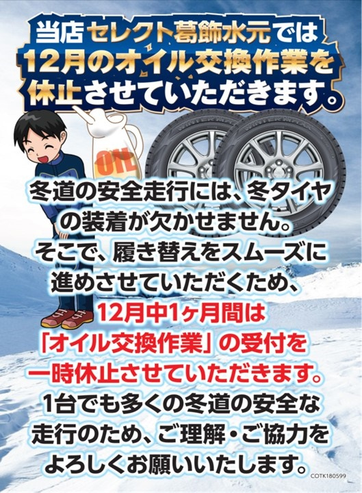 オイル交換と4輪アライメント作業の件ですが、当店では冬タイヤへの履き替えが多くなり、作業に専念して頂きたく12月中の作業をお断りさせて頂きます。
