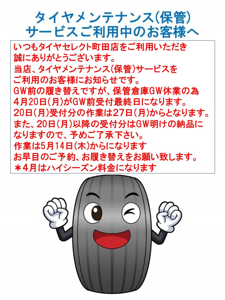 【重要】タイヤメンテナンスサービスご利用のお客様へ 皆様こんにちは(^^)/ タイヤセレクト町田店です タイヤメンテナンスサービスご利用のお客様へ お知らせです。 GW前の履き替えですが、保管倉庫GW休業の為 4月20日(月)がGW前最終受付となります 20日(月)受付分の作業は27日(月)からとなります。 また、20日(月)以降の受付分はGW明けの納品に なりますので、予めご了承下さい。 作業は5月14日(木)からになります お早目のご予約・お履き替えをお願い致します。 *4月はハイシーズン料金になります 2026.04.01