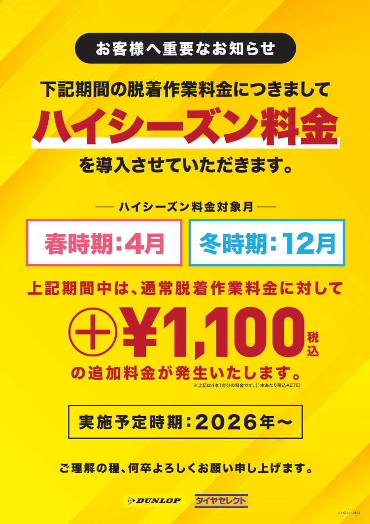 2026年度より、夏⇔冬の履き替え作業にハイシーズン料金を導入いたします。