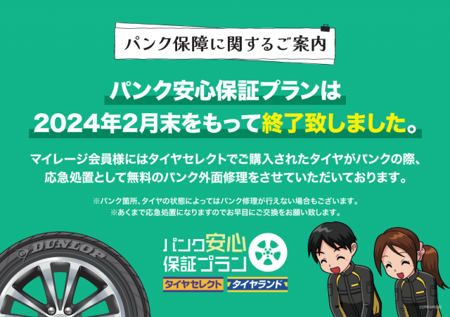 パンク保証は2024年2月をもって終了となっています。 パンク保証のご加入を御希望のお客様はダンロップの公式サイト オンラインショップで御購入頂きますと御加入頂けます。 ダンロップ公式オンラインショップ←こ...