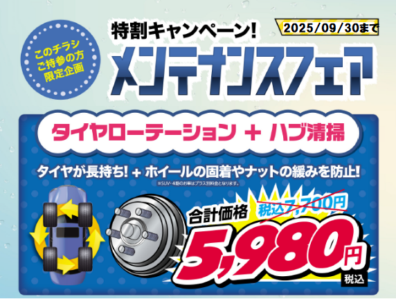 タイヤの空気圧点検はしているけど、溝のチェックまでしてないわ。 というお客様! 当店では空気圧点検に合わせて、残り溝のチェックも致します! 点検はもちろん無料です!(^^)! また9月いっぱいまで、ローテーション...