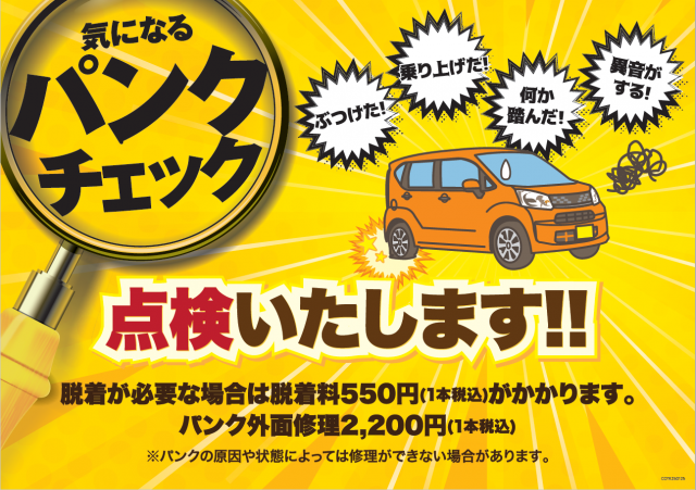 なんかタイヤから異音がするような? なにか踏んだ! 縁石にぶつけた! などなど。 タイヤを傷つけたかも?? この音なぁに? 気になる症状がありましたら、当スタッフにご相談ください(^_-)-☆