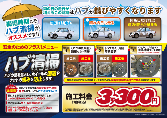 こんにちは!梅雨は何処へ~猛暑日連日、体調管理に御注意下さい! 今年は猛烈な勢いで作業させてもらってますハブ防錆作業は 【1台3,300円】 錆びは雨の日に促進!!放っておくと錆がどんどん広がってしまう!...