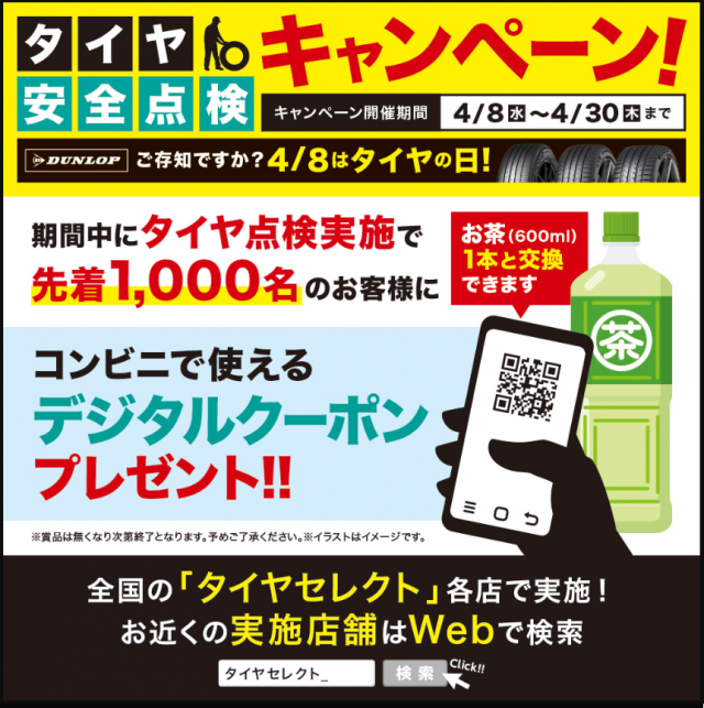 皆様こんにちは(^^)/ タイヤセレクト町田店です 4月8日はタイヤの日 それに伴い 4月8日~4月30日の期間 『春のタイヤ安全点検キャンペーン』 を実施しております! お出かけ前にタイヤの点検を行い 安全なドラ...