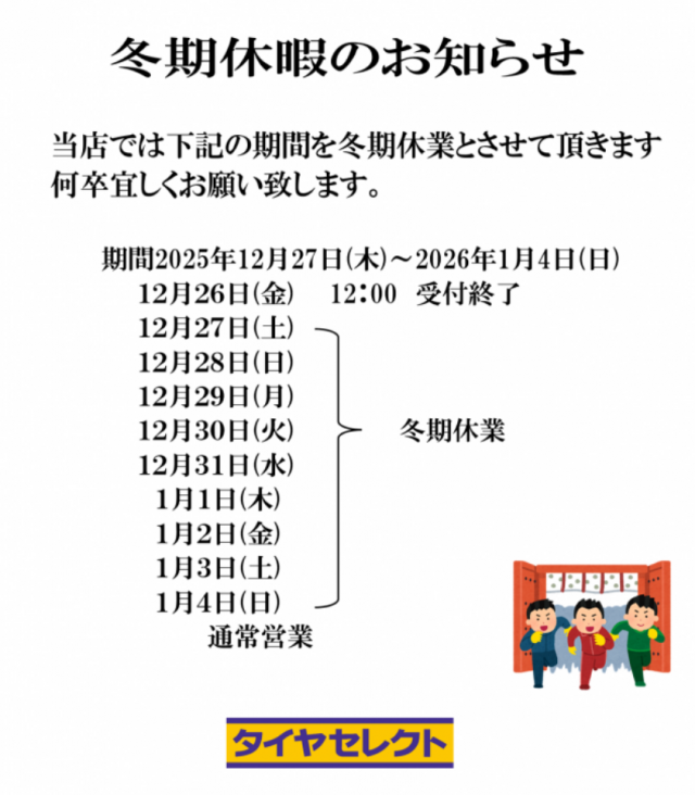 こんにちは。タイヤセレクト日野店です。 12月26日午後から1月4日までを冬期休業とさせて頂きますので宜しくお願い致します。