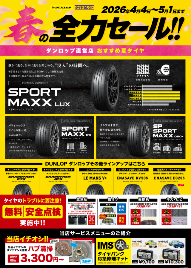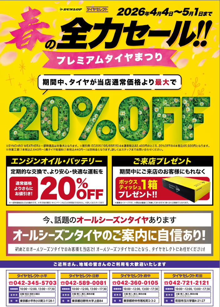こちらの期間中はタイヤを通常価格より最大で20%OFFさせて頂きます。