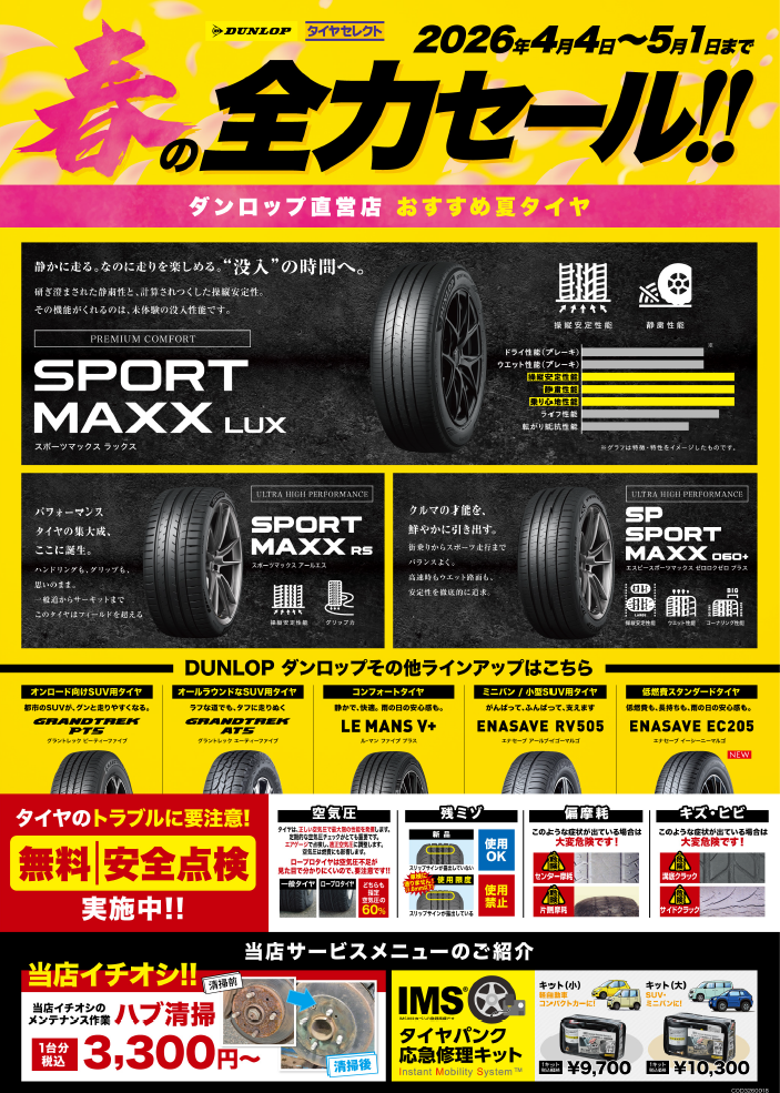 冬用タイヤから夏用タイヤへの履き替えシーズンになりますので、夏用タイヤの溝が
