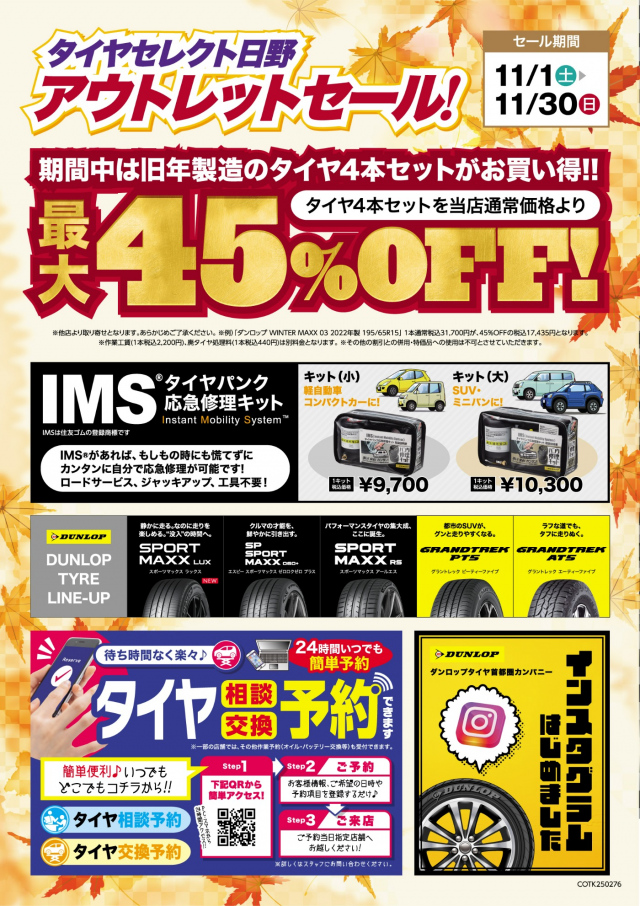 11月のセール こんにちは。 タイヤセレクト日野です。 製造の古い新品タイヤが最大45%OFFにてご提案させていただきます!! 数に限りがありますので気になる方はお早めにお願い致します。 2025.11.17