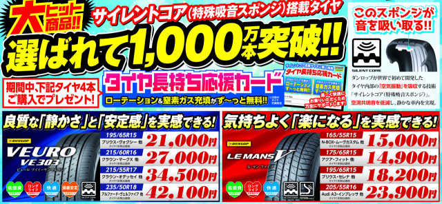 期間中、サイレントコア搭載タイヤ4本購入で、「タイヤ長持ち応援カード」を進呈★