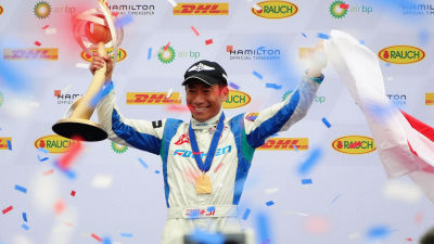 これには応援に駆けつけたインディ500ウィナーの佐藤琢磨選手も喜びを表す。