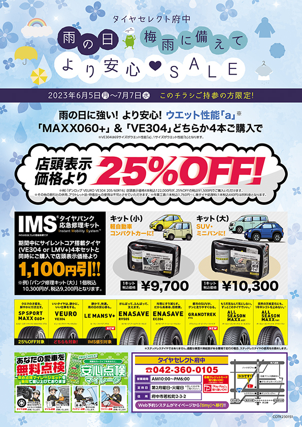 台風接近中?梅雨入り? 皆様こんにちは♪ 最近は雨の日が多くなってますね・・・。 台風2号の接近が影響していみたいですが すぐに東京も梅雨入りしそうな感じです・・・。 さて、そんな雨の多い季節に心強いタイヤ有ります! DUNLOP VE304&MAXX060+ どちらもウエット性能A 雨に強いタイヤありますよ~♪ さらに高速性能良し! 高速道路や長距離での移動が多い方 にもおすすめですよ~♪ 6/5(月)よりVE304&MAXX060+の お買い得セールも開催いたします♪ この機会にぜひ!お試しください♪ 2023.05.31