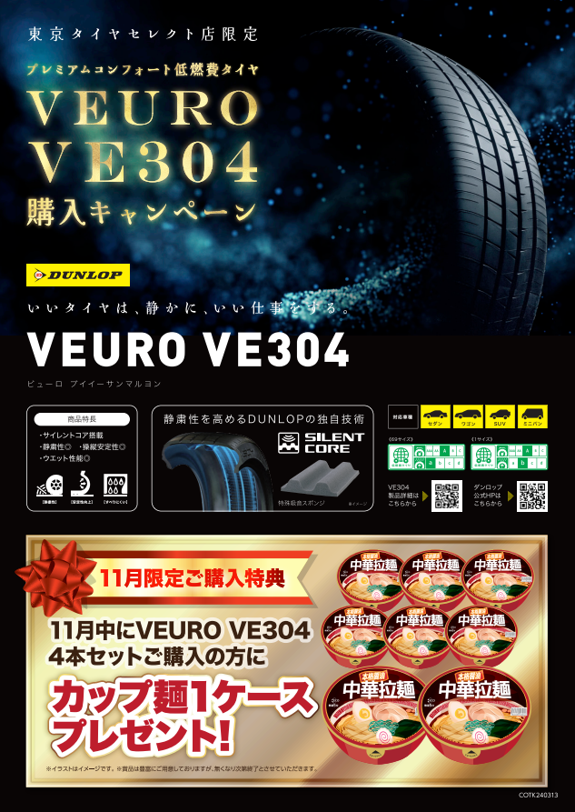 プレミアムタイヤがお得! みなさま、こんにちは! いつも当店のホームページをご覧いただきありがとうございます。 ★東京地区 タイヤセレクト店 限定★ ダンロップ プレミアムタイヤVE304購入キャンペーン! 4本セット購入でカップ麵1ケースプレゼント! 好評につき期間延長! タイヤ交換ご検討中のお客様ぜひ! 2024.11.30