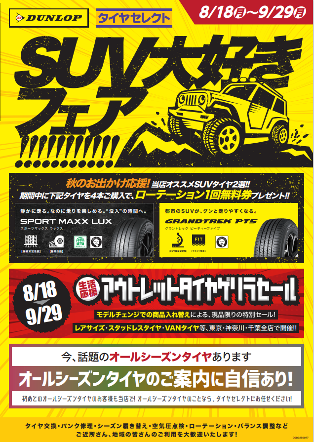 SUV大好きフェア!まもなく終了 みなさま、こんにちは! いつも当店のホームページをご覧いただきありがとうございます。 開催中のSUV大好きフェア終了間近です。 9月29日(月)まで 対象タイヤ4本購入でローテーションが1回無料! タイヤ交換、ご検討中の方 ぜひ、この機会に! 2025.09.25