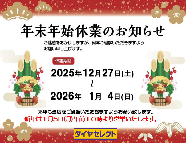 年末年始のご案内 みなさま、こんにちは! いつも当店のホームページをご覧いただきありがとうございます。 年末年始のご案内です。 当店は本日26日の営業で年内最終となります。 新年は1月5日(月)から営業いたします。 来年もどうぞタイヤセレクト府中店を宜しくお願いいたします。 2025.12.26