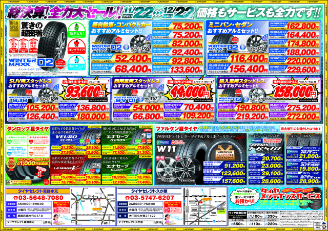 お知らせ12月22日~本日が最終日です!~ 皆様こんにちは 天気がすぐれない東京です 本日もタイヤセレクト久が原店は営業いたします そしていよいよ本日が 冬の全力セール!! 最終日です!! まだ間に合いますので 皆様のご来店をお待ちしております 2019.12.22
